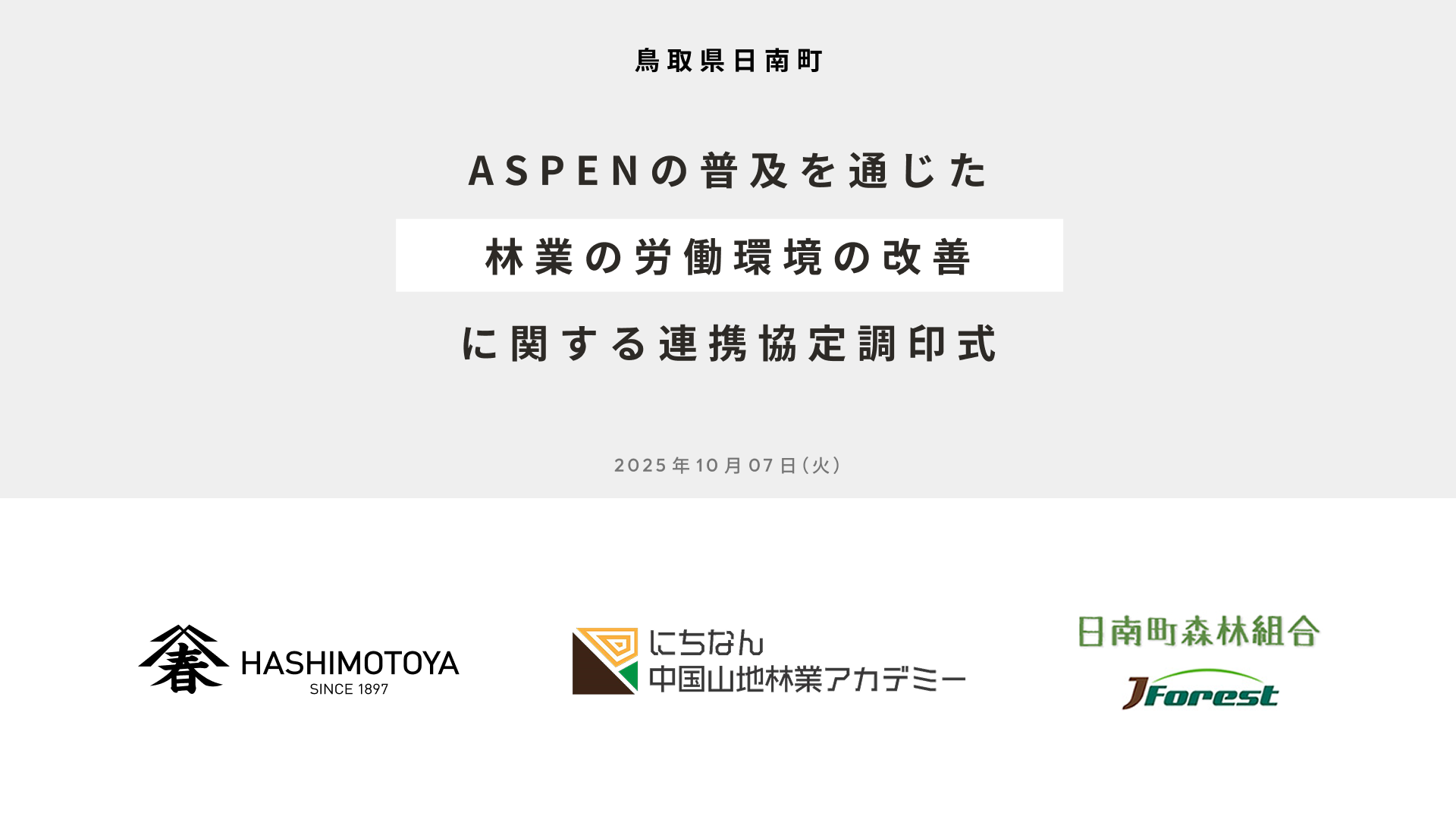 株式会社橋本屋(本社:東京都文京区、代表取締役:東原 正典)は、2025年10月7日(火)、日南町役場にて、にちなん中国山地林業アカデミー(日南町立林業アカデミー)および日南町森林組合と「ASPENの普及を通じた林業の労働環境の改善に関する連携協定」を締結し、調印式を執り行いました。