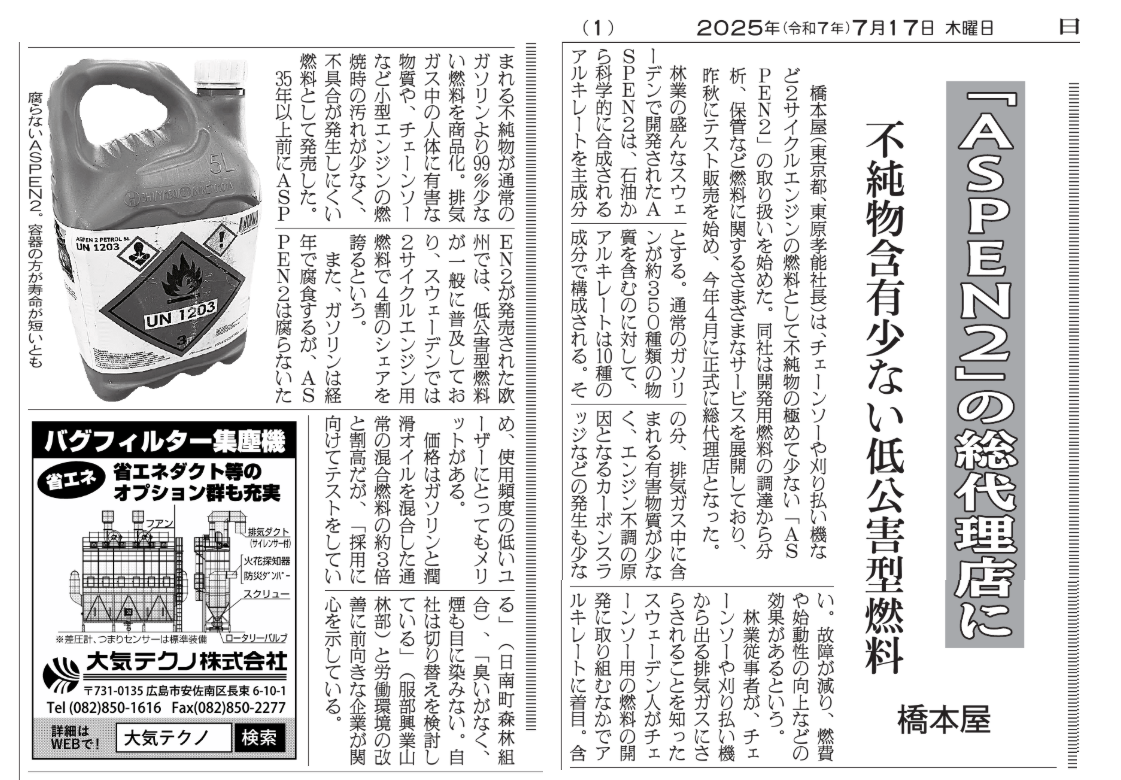 2025年7月17日に発行された『日刊木材新聞 20248号』に、橋本屋が有害ガス削減燃料「ASPEN2」の総合代理店としての取り組みを開始したことに関する記事が掲載されました。